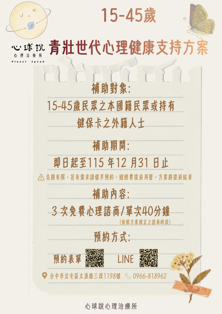 申請資格 15–45 歲之本國籍民眾/持有健保卡之外籍人士 申請流程 請填寫預約表單(https://reurl.cc/AbY6qE )、加入官方line(https://lin.ee/5VrlbxI)並回傳「青壯方案」 因名額有限,將依表單順序與您聯絡確認諮商時間、依填寫需求媒合合適的心理師 諮商當天請務必準備 「可證明年齡之身份文件」